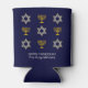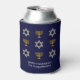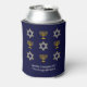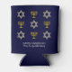 Elegant HAPPY HANUKKAH can cooler, showing faux gold and silver STAR OF DAVID and MENORAH in a tiled pattern against a rich NAVY BLUE background. Text reads HAPPY HANUKKAH with a placeholder name, and is CUSTOMIZABLE, so you can PERSONALIZE it by adding your name or other text. Ideal for Hanukkah celebrations, and with customisation can be suitable for any Jewish-themed event. Choose from a wide selection of can coolers by Berean Designs.