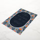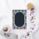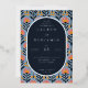 This elegant foil invitation features a modern yet vintage-inspired design with a rectangular layout and an ornate floral border. The background showcases a repeating pattern of stylized coral, peach, and blue flowers on a light blue backdrop, creating a vibrant and harmonious look. At the center, a navy oval contrasts sharply with white text in a classic serif font, offering customizable placeholders for names, dates, and locations. The overall mood is one of sophistication and celebration, perfect for formal events like weddings, with a touch of joyful festivity emphasized by the bright floral accents.