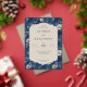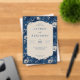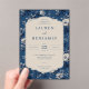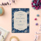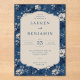 This elegant wedding invitation features a classic rectangular layout with a navy blue background adorned by large white roses and green leaves, creating a sophisticated frame around the central cream-colored text block. The design employs a vintage style with serif fonts that enhance its formal and timeless appeal, perfect for a traditional celebration. Customizable elements allow personalization of names, dates, and venue details, making it ideal for couples seeking an exquisite and personalized touch for their special day. The overall mood is one of refined elegance, suitable for a memorable and joyous occasion.