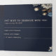 Announce your wedding in timeless style with this elegant navy floral tri-fold invitation. Featuring ivory and dusty blue blooms, a custom photo panel, and a tear-off RSVP card, it offers charm and convenience in one. Add your event details, engagement photo, and an optional QR code to create a romantic, all-in-one invitation perfect for fall or winter weddings.