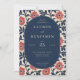 This elegant wedding invitation features a central oval frame surrounded by a vibrant floral border in shades of deep navy blue and coral red, creating a striking contrast against the white background. The design showcases stylized flowers and leaves arranged in a grid-like pattern, adding a decorative touch without overwhelming the text. With a vintage feel emphasized by serif typography, the layout is symmetrical and classic, conveying a formal and celebratory mood perfect for a sophisticated event. Customizable elements allow personalization for names, dates, and addresses, making it ideal for marking this special life moment.