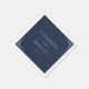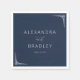 This wedding napkin design features a minimalist and elegant layout with a deep navy blue background, creating a sophisticated and timeless look. The central text is arranged in a clean, modern sans-serif font for the names, complemented by a stylish cursive script for "and," while the date is presented in a smaller serif font, adding a formal touch. Geometric decorative elements in the corners echo an Art Deco influence, enhancing the overall symmetry and balance. The crisp white accents contrast beautifully against the navy backdrop, ensuring readability and visual impact, making it perfect for a refined and luxurious wedding celebration.