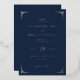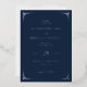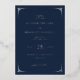 This elegant wedding invitation features a deep navy blue background with crisp white text and decorative geometric borders, creating a sophisticated and formal atmosphere. The layout is balanced and structured, with a mix of serif fonts that convey classic refinement and cursive script adding a personal touch. Ideal for couples seeking a timeless design, this invitation sets the tone for an intimate and memorable celebration.