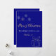 The design combines a luxurious deep–blue background, gold script lettering, delicate hanging snowflakes, and a minimalist line-art gift illustration.