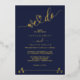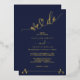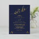 This sophisticated wedding invitation showcases a luxurious gold foil design with intricate navy flourishes. Featuring elegant hand-lettered typography and delicate swirls, the modern yet timeless style is perfect for a classic wedding. The rich dark blue background enhances the shimmering gold foil details, creating a refined and romantic touch.