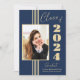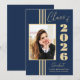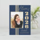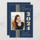 This Class of 2024 elegant stylish graduation announcement features gold stripes, photo frame, and text on a navy blue background.