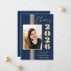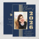 This Class of 2025 elegant stylish college graduation announcement features gold stripes, photo frame, and text on a navy blue background.