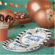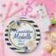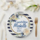 Celebrate your graduation with elegance and class with this gorgeous navy blue, white, and gold paper plate. Features a stunning deep navy blue with white stripes background, accented with stunning blue and white floral arrangements. Personalised to whatever party detail you need.