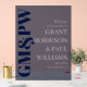 Acrylic welcome wedding sign with grey and navy blue typography printed on a transparent dark blue background. Monogrammed wedding welcome sign printed on acrylic with a transparent dark blue background, your initials in navy blue, and additional wedding welcome text in grey.