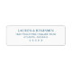 This return address label features a clean, minimalist design with ample negative space, creating an elegant and sophisticated look. The deep navy blue text is set against a crisp white background, enhancing readability and contrast. Utilizing a formal serif font, the layout emphasizes clarity and balance, making it ideal for official or ceremonial occasions. Perfect for personalization, this label combines simplicity with a touch of formality, suitable for weddings, invitations, or any special event where a polished presentation is desired.