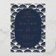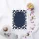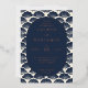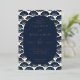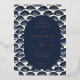 This elegant wedding invitation features a classic rectangular layout with a central oval frame, surrounded by a repeating pattern of stylised seashells. The colour palette includes deep navy blue and gold accents on a white background, creating a luxurious and sophisticated look. The design employs clean lines and serif typography to convey formality and clarity, while the shell motifs add a subtle nautical theme. Perfect for formal occasions, this invitation exudes an inviting and celebratory mood, ideal for couples seeking a timeless and refined aesthetic for their special day.