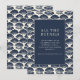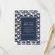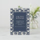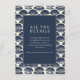 This elegant wedding enclosure card features a sophisticated navy blue colour palette with a repeating shell motif border, creating a classic and refined look. The central panel is framed by intricate, symmetrical shells arranged in a grid pattern, adding visual interest without overwhelming the design. The text is presented in a clean serif font, with "ALL THE DETAILS" prominently displayed at the top, guiding guests to visit a customisable website for more information. The overall layout is balanced and professional, making it perfect for formal weddings that aim to convey organisation and thoughtfulness.