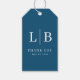 This wedding favor tag features a minimalist and elegant design with a deep navy blue background. The layout centers on bold, white serif typography displaying initials "L | B" separated by a vertical line, creating a sophisticated focal point. Below, the words "THANK YOU" are printed in smaller, capitalized letters, conveying gratitude. The overall style is modern yet timeless, perfect for expressing appreciation at your special event.
