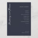 This elegant wedding program features a deep navy blue background with a minimalist layout, creating a sophisticated and formal atmosphere. The design includes a flowing script font for the names on the left, paired with clean, centered sans-serif typography for the ceremony details on the right, ensuring clarity and readability. Customizable elements allow personalization of dates and locations, making it perfect for any wedding celebration. The overall style is refined and modern, ideal for couples seeking an understated yet stylish way to guide their guests through the special day.