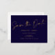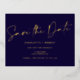 Modern elegant real gold foil script navy blue wedding save the date with a casual and cool script calligraphy .