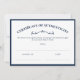 Elegant and minimalist certificate of authenticity in navy and white with dark blue borders and a swirly divider.