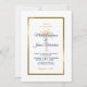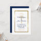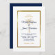 Invite your guests to help you celebrate your special day with this elegant invitation featuring modern script, navy blue and gold text including an artistic palm tree and metallic gold frame on the front of the card. A navy blue background is on the back.