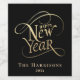 Modern black wine labels for your New Year Eve party or gifts featuring "Happy New Year" written in an elegant gold script. Personalise with your name and the new year.