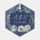 Bold navy blue and white peony floral monogram Christmas ornament keepsake gift for a modern couple who is newly married. An elegant botanical wreath of green leaves unfolds around trendy handwritten white initials of the bride and groom for a commemorative first Christmas present.