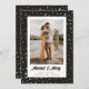 Modern black and gold Married and Merry photo Christmas card featuring a black and gold starry pattern.