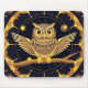 Stylised illustration of a night owl perched on a branch surrounded by gold and blue patterns, evoking a magical and mystical ambiance, ideal for decorative or artistic purposes.