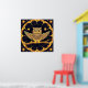 Stylised illustration of a night owl perched on a branch surrounded by gold and blue patterns, evoking a magical and mystical ambiance, ideal for decorative or artistic purposes.