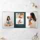 Elegant faux pale gold frame adorned with winter berry branches on festive muted emerald green colour backgrounds. Design features, framed bold type NOEL, template text lines for names, year and messages with 5 photo spaces on inside.