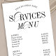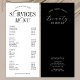 Elegant Business Price List with nostalgic calligraphy font in a minimal black and white design. This trendy services menu includes space for your pricing, business logo and contact details. This price sheet is fully editable and is perfect to use as a menu rack card for your beauty spa, lash bar, hair salon or any other professional services.