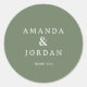This wedding sticker features a minimalist design with a solid olive green background, creating an elegant and sophisticated look. The clean, sans-serif typography prominently displays the names "Amanda & Jordan" in bold white letters, accompanied by a stylized ampersand, while the phrase "thank you" is subtly placed below in a lighter font weight. The simple layout emphasizes clarity and balance, making it perfect for expressing gratitude at your special event. Ideal for modern weddings, this sticker combines understated elegance with a heartfelt message.