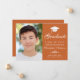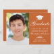 Send your family and friends a unique personalised photo graduation card featuring your custom photo on the left and to the right a white grad cap with the word "Graduate", class/year, name and other ceremony details in formal white script calligraphy to personalise on an orange background. Designed by ©Susan Coffey.