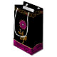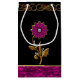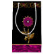 Beautiful gift bag done in black, with an orchid coloured foil look edged in gold, along the bottom. Graphics of an ornate gold and pink gem scroll border decoration, runs across the top of the bag, with a gold flower jewel, in the middle, with gem like accents. Customise to add text to this glamourous gift bag.