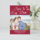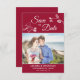 Elegant and romantic Save The Date photo card, featuring a beautiful and delicate white orchids floral line drawing on the upper part, over a classy Crimson red background. Easily personalizable by adding one of your favourite engagement horizontal pictures, and by editing the template fields on the dark red lower band with your names, date, and location in a modern and simple white all-caps font.