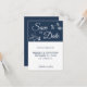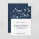 Elegant and romantic Save The Date card featuring a beautiful and delicate white orchids line drawing design at the top, over a classy Prussian blue background. The lower part is easily personalizable by editing the template fields with your names, date, and location in a modern and simple dark blue all-caps font over a simple white background.