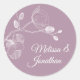 Elegant and romantic wedding sticker for your envelopes or for your wedding favour, featuring a beautiful and delicate white orchids line drawing design at the top, over a plain dusty purple background. Easily edit the template fields to add the bride and groom names in a classic script.