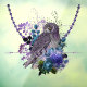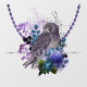 .An elegant design featuring an owl, flowers, jewel gemstone sparkle and pearls. In colours of purple, blue, grey and teal. A glamourous vintage nature bird and flowers design .