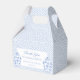 Stylish favour boxes with a blue and white Greek Key pattern background, a watercolor ginger jar on each side of the front panel, together with the personalised text.