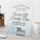 This beautiful self-standing pedestal sign will let your guests know that there is no seating plan so they can sit wherever they like. It features a simple yet elegant design with a single long-stemmed light powder blue or dusty blue coloured rose reflecting in a pool of water. Text reads: Come as you are, stay as long as you can, We're family now, so there's no seating plan. Perfect way to invite your guests to mingle and meet each other.