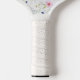 This elegant floral pickleball paddle for her has pastel blue and pink flowers against a white background. Personalise name.