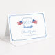 Combine patriotism and elegance with this stylish thank you card design featuring a hand-painted blue crest with American flags on each side. This design is shown as a wedding "thank you" card but would also work well as personalised stationery. This is surrounded by a classic mid blue "Greek Key" border and matching pattern backer. You can change the contrast colour of the Greek Key on the front and back (shown here as a mid blue) to any colour you like by entering the design tool (underneath the text customisation area, click to "customise further") then changing the background colour on the respective layer.