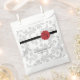 This design features elegant vintage leaf pattern and personalised wax seal image. The damask grey leaf patterned background contrasts against the black ribbon and red wax seal. The combination of grey, red, black and white colours create a sophisticated, trendy and chic style. Elegant wedding favour bag design with modern elements. The simple setup of the typography gives it a distinct style. Matching wedding invitations and other stationery items are also available.