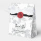 This design features elegant vintage leaf pattern and personalised wax seal image. The damask grey leaf patterned background contrasts against the black ribbon and red wax seal. The combination of grey, red, black and white colours create a sophisticated, trendy and chic style. Elegant wedding favour box design with modern elements. The simple setup of the typography gives it a distinct style. Matching wedding invitations and other stationery items are also available.