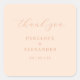 This wedding sticker features a minimalist design with a soft peach background and delicate gold typography. The layout includes a flowing cursive "thank you" at the top, followed by two names in an elegant serif font, creating a warm and sophisticated look. Ample negative space enhances its clean aesthetic, making it perfect for expressing gratitude at your special event. The modern yet timeless style conveys celebration and refinement, ideal for adding a personal touch to your wedding favours.