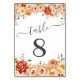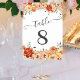 Elegant table numbers adorned with watercolor flowers in shades of orange, red, yellow, and peach, accompanied by lush green leaves, forming a stunning bouquet. Perfect for weddings or other events.