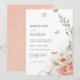 The modern and elegant design features beautiful peach and white flowers with greenery and white ribbons, on top of some rose-gold sparkles. The rose petal confetti adds an additional final special touch.