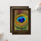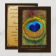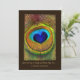 An elegant peacock themed wedding invitation with a beautiful photograph of a romantic peacock feather with a royal blue heart shaped eye framed in a rich brown filigree frame and subtle gold writing that reads: Before the eyes of family and friends they vow. Personalise the customisable text on the back of this beautiful wedding ceremony invitation by adding the name of the bride and groom.