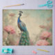 image 1 of 4 large scale French Floral Peacock for decoupage, 2 horizontal & 2 vertical. An elegant, French floral vintage ephemera collage a beautiful peacock in a rose garden setting. Aged distressed parchment paper cream background with incredibly beautiful blush pink flowers and a soft pink Peony, muted foliage and pretty dusty sage green foliage. There is a faint crackle texture that adds an aged and antiqued, script handwriting ephemera and typography elements. It was graphically designed by internationally licensed artist, Audrey Jeanne Roberts, copyright. MSP0118