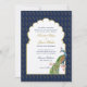 Elegant ethnic style wedding invitation featuring watercolor peacock in a golden arch with a gold and navy blue paisley background. Perfect for Indian wedding.