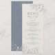 Vintage, boho, floral dusty blue wedding menu with elegant periwinkle and simple handwritten script.