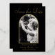 For this save the date, the couple's photo is surrounded by a real foil arch frame. Choose from gold, silver, or rose gold for the foil. The couple's names, wedding date and location sit below the frame.. The back of the card is black.