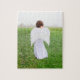 Beautiful back view of a young angel girl with curly hair in a field of luscious green grass and a white sky. Elegant, modern, trendy painterly photograph gives a very peaceful feeling. This angel puzzle will make a great gift. Give the Spirit of Christmas to your special loved one. Look for matching products in my store collection. Image copyright Marg Seregelyi Photography.